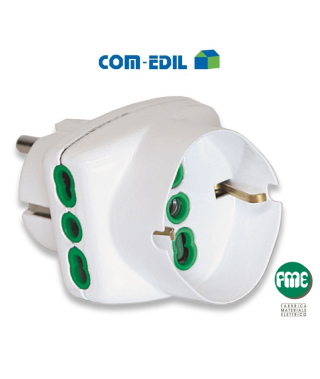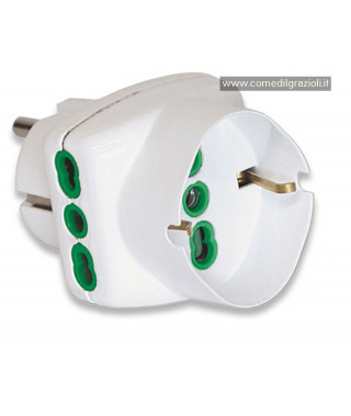 Adattatore triplo spina franco/tedesco 2P+T 16A. 2 prese bipasso P17/11 + 1 presa bip./ted. 2P+T 16A. Costruiti in riferimento alle norme CEI 23-50 e CEI 23-57.