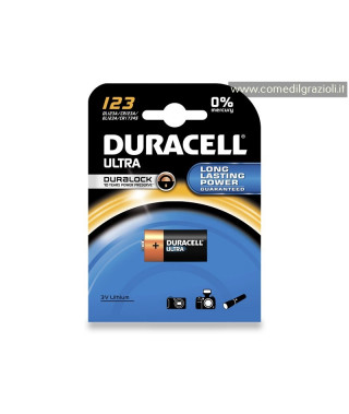 PILE DURACELL ULTRA PHOTO 123 Pila Duracell DL123 3 Volt specifica per macchine fotografiche. La pila Duracell ultra con struttura chimica al Litio è stata progettata specialmente per offrire prestazioni di maggior durata. Duracell Ultra è la pila più potente, che offre energia, efficienza e alimentazione inesauribili. Adatta in particolare per Fotocamere e Macchine fotografiche reflex a lente singola (SLR, Single-Lens Reflex). Pile equivalenti: IEC 17345 - Energizer/Ucar EL123AP, EL123A, EL123 - Varta CR123A, V123 - Kodak K123LA, KL123LA - Panasonic CR123A - Rayovac/Vidor CR123R - Sony CR123 - Altri DL123A.