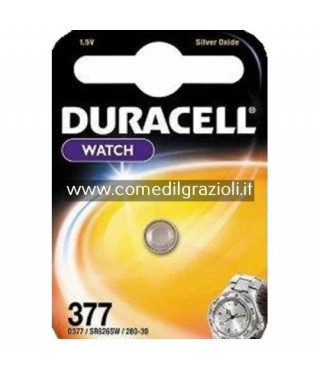 PILE DURACELL WATCH 377 Duracell propone un'ampia gamma di batterie specialistiche per dispositivi elettronici che richiedono la potenza affidabile delle batterie a bottone. Le batterie agli ossidi d'argento Duracell sono pensate per dispositivi elettronici (calcolatrici, esposimetri), medici, orologi e giocattoli. Pile equivalenti: IEC SR66 - Energizer/Ucar 377 - Varta V377 - Kodak KS377 - Panasonic SR626SW - Rayovac/Vidor 377, RW329, 376/377-1W - Seiko SR626SW, SB-AW - Sony 280-39 -Philips 377 - Renata 377 - Altri D377, R377/37, BA.