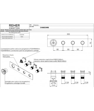 REMER - SET MISCELATORE A INCASSO A 3 VIE PER VASCA/DOCCIA SU UNA PIASTRA, SERIE CHRONO COLORE VISUAL INOX