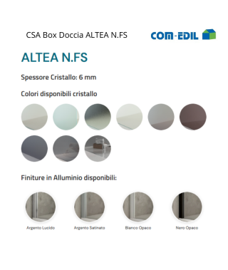 Questa gamma di finiture ti consente di adattare la doccia al tuo stile e di creare un ambiente unico nel tuo bagno. In conclusione, la doccia in nicchia “Altea N.fs” rappresenta una scelta di design eccellente e funzionale. Con le sue caratteristiche tecniche di alta qualità, la vasta gamma di colori e finiture disponibili, questa doccia è uno dei modelli più belli e funzionali della gamma CSA. Sia che tu stia cercando una soluzione per un bagno moderno o tradizionale, la doccia “Altea N.fs” saprà soddisfare le tue aspettative in termini di estetica, durabilità e funzionalità.