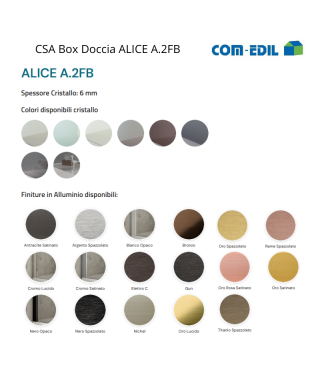 I profili sono disponibili in diverse finiture, tra cui cromo lucido, satinato, bianco, nero opaco e altre varianti colorate. Questo ti consente di scegliere la finitura che si adatta meglio al tuo stile e alla tua estetica preferita. Le finiture dei cristalli offrono ulteriori possibilità di personalizzazione. Puoi optare per il vetro trasparente per una sensazione di apertura e luminosità, o scegliere il vetro satinato per una maggiore privacy. Inoltre, sono disponibili finiture speciali come trasparente extra chiaro, trasparente grigio, trasparente bronzo, satinato grigio, stopsol grigio e mirror (effetto specchio), per soddisfare le tue esigenze di design e creare un’atmosfera unica nel tuo bagno. In sintesi, la doccia ad angolo “Alice A.2fb” unisce estetica, funzionalità e qualità superiore.