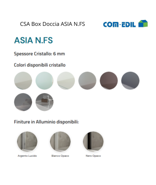 La doccia “Asia N.fs” offre la possibilità di personalizzare il look con diverse finiture per i profili, tra cui cromo, nero opaco, bianco opaco e argento lucido. Inoltre, puoi scegliere tra varie finiture dei cristalli, come trasparente, satinato e altre speciali come trasparente extra chiaro, grigio, bronzo, satinato grigio e mirror (effetto specchio).