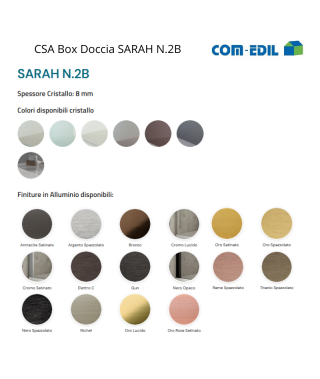 I profili della porta doccia “SARAH N.2B” sono dotati di chiusura magnetica, assicurando una tenuta ermetica e impedendo la fuoriuscita di acqua. Questo garantisce un ambiente doccia asciutto e sicuro, evitando fastidiosi schizzi d’acqua all’esterno. Inoltre, i profili sono disponibili in tre eleganti finiture: cromo lucido, satinato e nero opaco. Potrai scegliere la finitura che si adatta al tuo stile e all’arredamento del bagno, aggiungendo un tocco di raffinatezza e modernità.