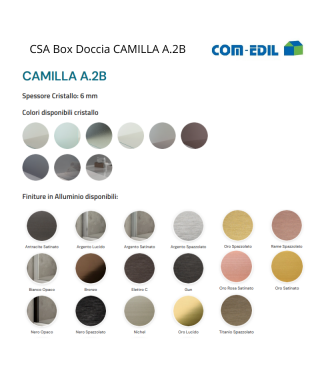 Per soddisfare le diverse preferenze di stile, i profili della doccia sono disponibili in una gamma di finiture, tra cui bianco, nero opaco, argento lucido, satinato, nichel, oro lucido, oro satinato, bronzo, oro rosa satinato e antracite satinato. Queste opzioni permettono di integrare la doccia “Camilla A.2B” in qualsiasi arredamento, garantendo una perfetta armonia nel bagno.