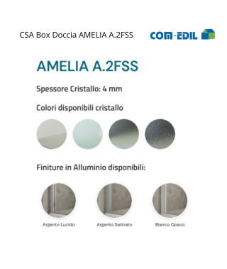 I profili della doccia “Amelia A.2fss” sono disponibili in finiture di argento satinato, lucido e bianco opaco. Questa scelta di finiture consente di adattare la doccia allo stile e alla decorazione del bagno, creando un’atmosfera armoniosa e coerente.