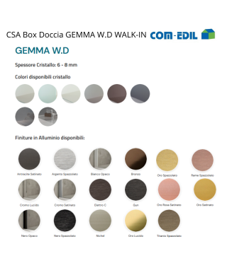 I profili della doccia “Gemma W.D” sono disponibili in una vasta gamma di finiture, come cromo, bianco, nero opaco e varie opzioni colorate, come l’oro lucido, l’oro satinato, il nichel, il bronzo, l’oro rosa satinato e l’antracite satinato. Queste finiture permettono di abbinare la doccia al design complessivo del bagno, creando un ambiente armonioso e di classe. Con la sua combinazione di design elegante, praticità e una vasta scelta di finiture, la doccia Walk-In “Gemma W.D” offre un’esperienza di doccia unica e di alta qualità, rendendo il bagno un luogo di lusso e comfort.