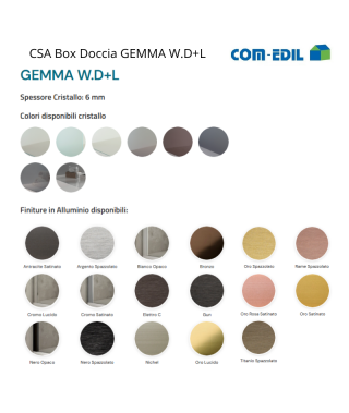 La scelta delle finiture del cristallo offre diverse opzioni di personalizzazione. È possibile optare per il trasparente, satinato, trasparente extrachiaro, trasparente grigio, trasparente bronzo, satinato grigio e mirror (effetto specchio). Queste finiture consentono di adattare la doccia allo stile e alle preferenze individuali, creando un aspetto unico e personalizzato.