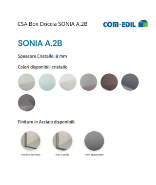 In sintesi, il modello “Sonia A.2b” è un’ottima combinazione tra funzionalità e design, ideale per chi desidera un box doccia dallo stile sofisticato e dalle prestazioni affidabili. Grazie alla sua struttura solida, materiali di alta qualità e varietà di scelta nei vetri e profili, questo box doccia è una soluzione di alto livello per aggiungere un tocco di lusso al proprio bagno.